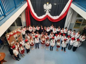 Z okazji Narodowego Święta Niepodległości uczniowie z klas 2b, 3a i 3b przygotowali dla klas 0-3 piękne przedstawienie pt. „107 rocznica odzyskania niepodległości przez Polskę”.