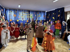 Podczas przedstawienia „Stroje Pani Jesieni” uczniowie z oddziałów przedszkolnych, uczennica z kl. 2b i uczeń z kl. 3c zaprosili wszystkich w niezwykłą, barwną podróż po jesiennym świecie.