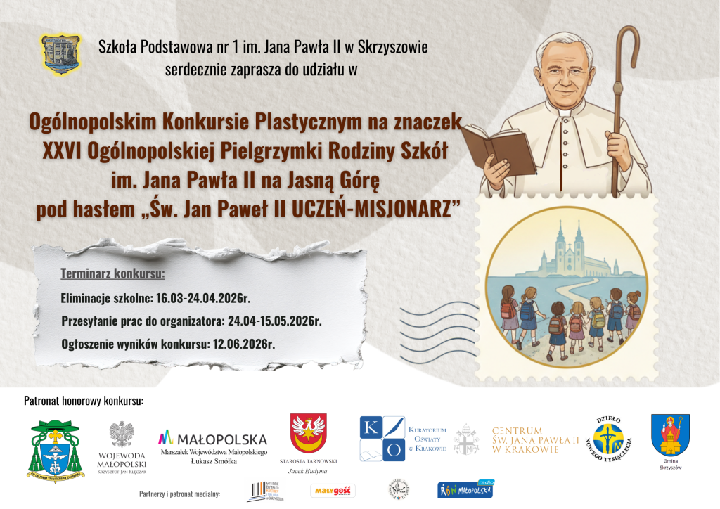 Zachęcamy do udziału w Ogólnopolskim Konkursie Plastycznym na znaczek XXVI Ogólnopolskiej Pielgrzymki Rodziny Szkół im. Jana Pawła II na Jasną Górę pod hasłem „Św. Jan Paweł II UCZEŃ-MISJONARZ”.