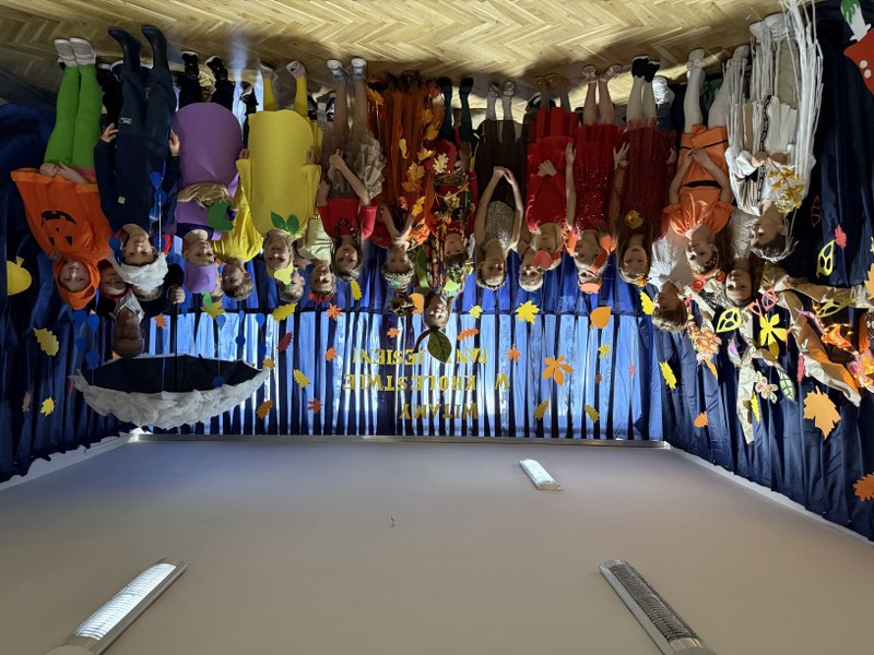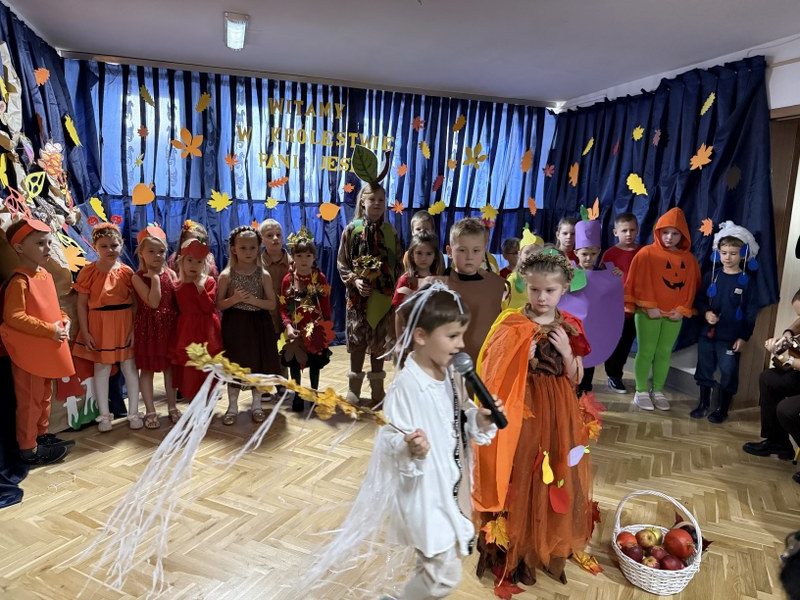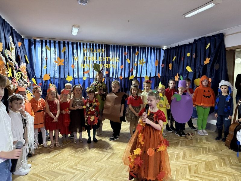 Podczas przedstawienia „Stroje Pani Jesieni” uczniowie z oddziałów przedszkolnych, uczennica z kl. 2b i uczeń z kl. 3c zaprosili wszystkich w niezwykłą, barwną podróż po jesiennym świecie.