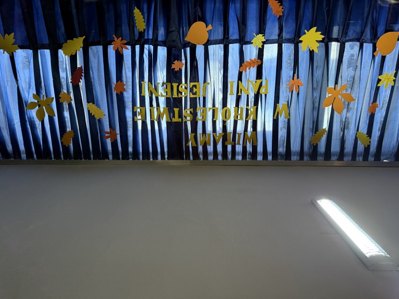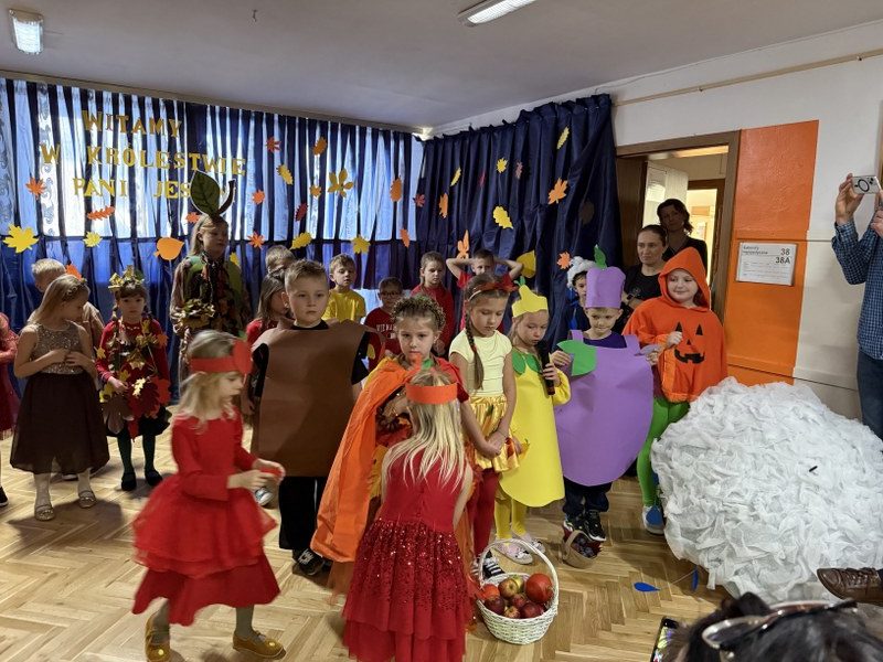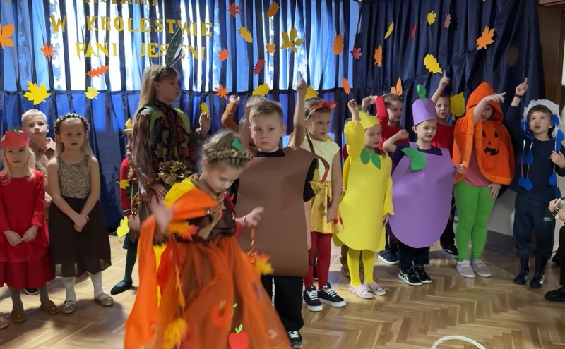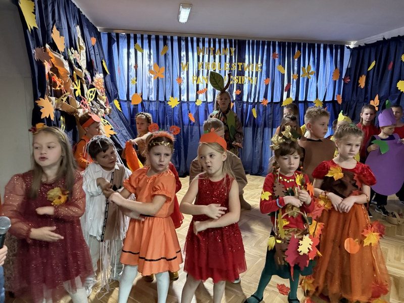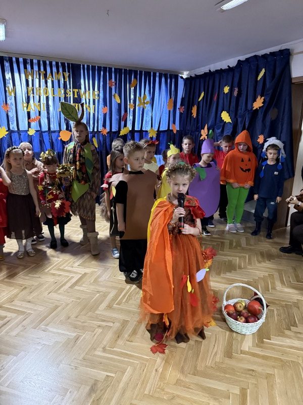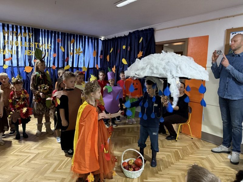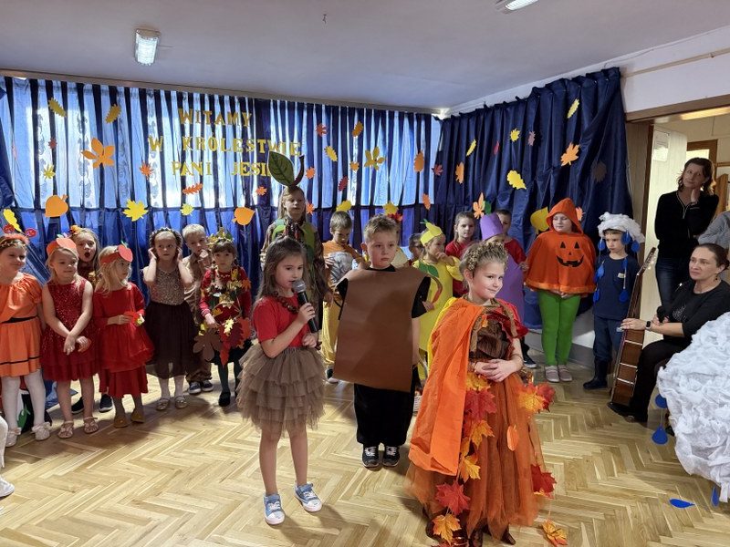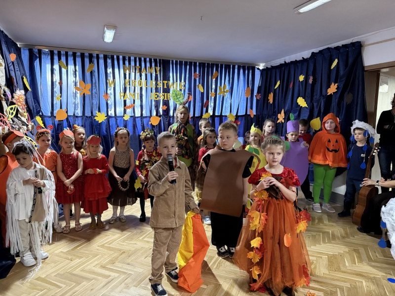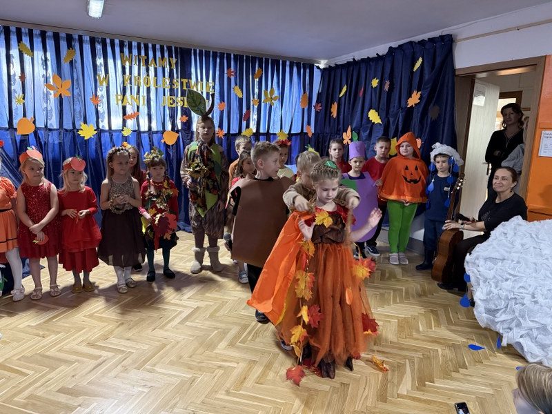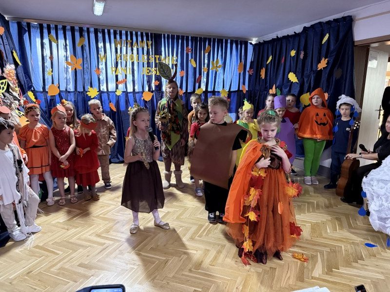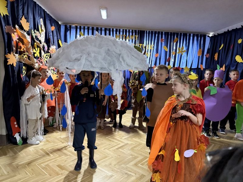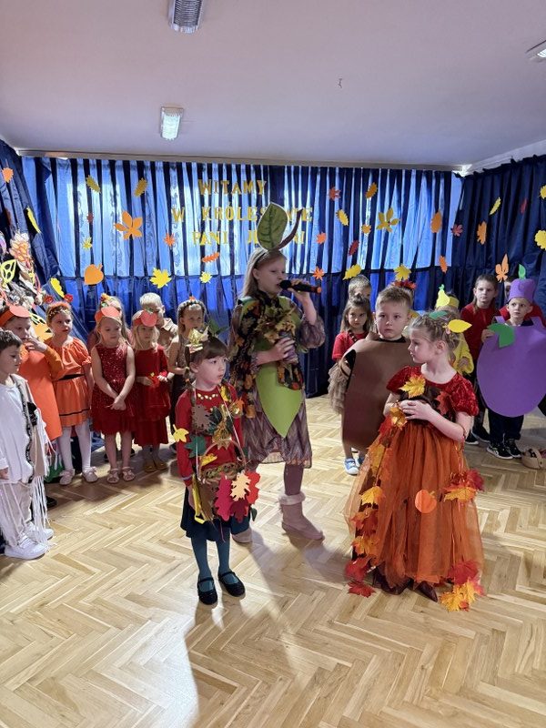 Na scenie pojawiła się Pani Jesień – początkowo skromna i zmartwiona bez swojego słynnego płaszcza z liśćmi. Ale nie martwiła się długo. Przy dźwiękach radosnych piosenek z pomocą przyszli nasi mali aktorzy – pełni pomysłów, uśmiechów i fantazji. Ubierały Panią Jesień kawałek po kawałku, aż na koniec stała się prawdziwą królową tej barwnej pory roku!