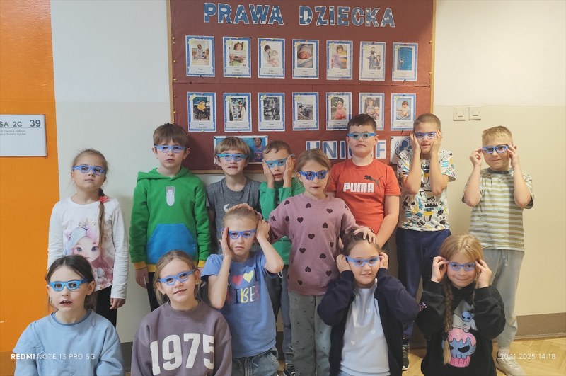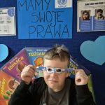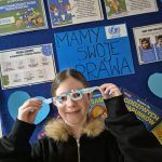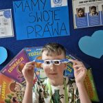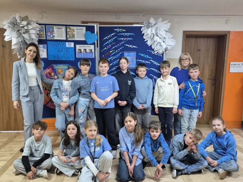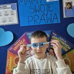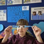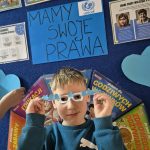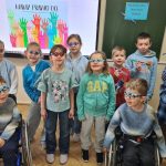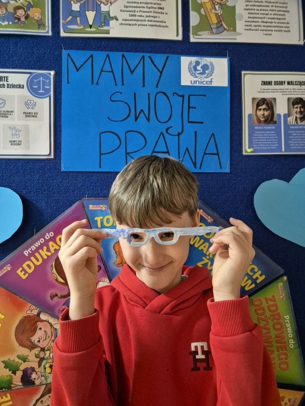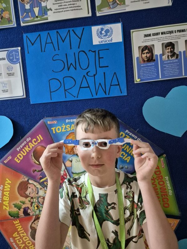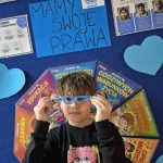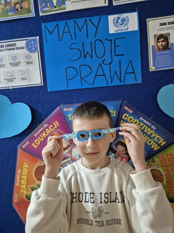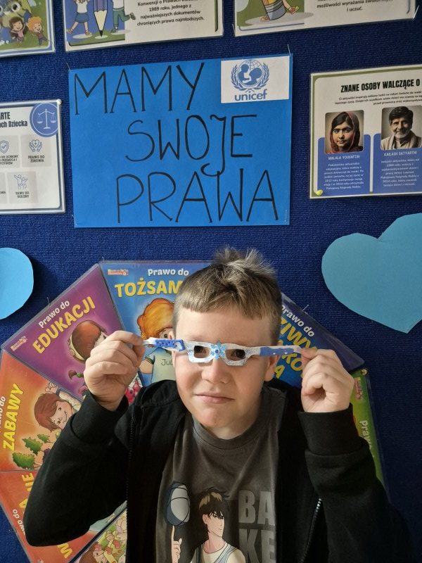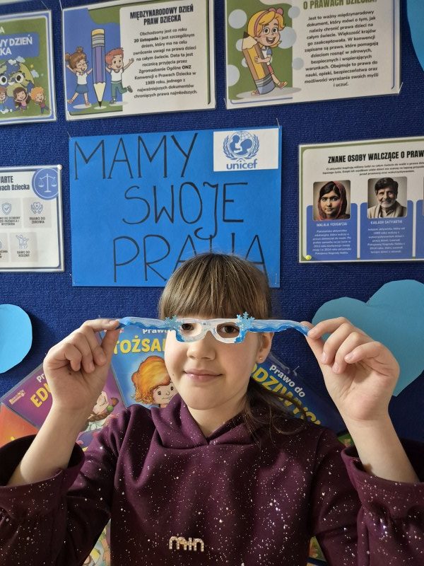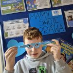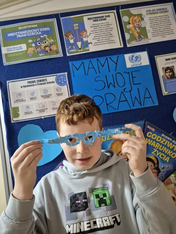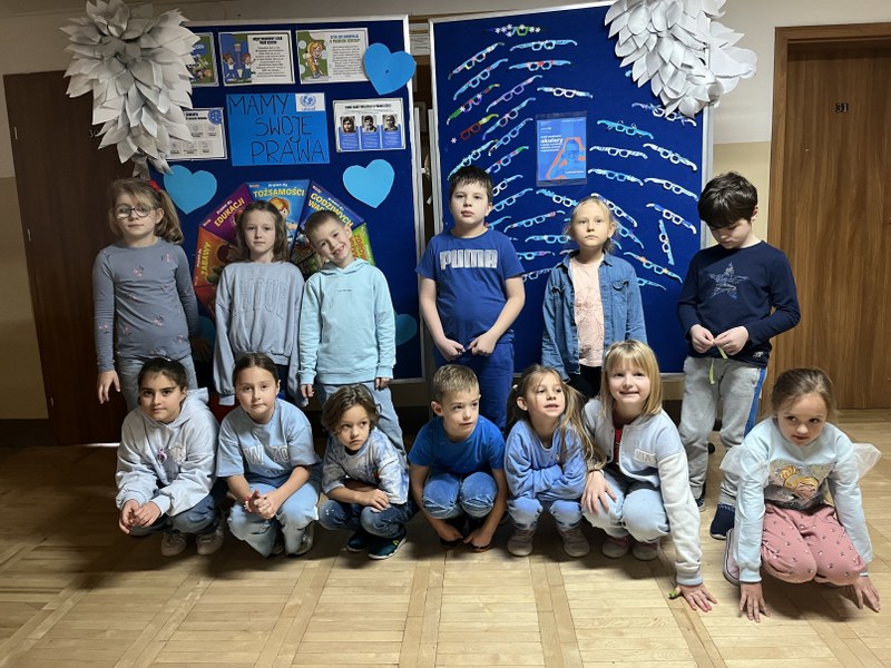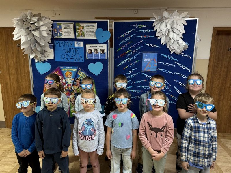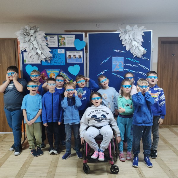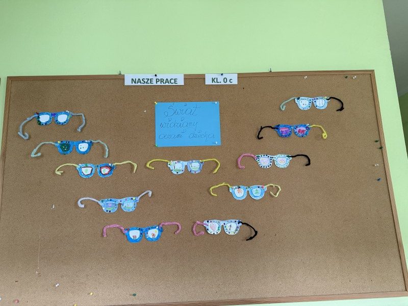 Największym sukcesem okazała się akcja „Świat widziany przez niebieskie okulary”. Każde dziecko ozdobiło swoje niebieskie oprawki, które stały się symbolem patrzenia na świat oczami młodych ludzi. W holu na dolnym korytarzu powstała piękna, niebieska galeria. Wystawa tych unikalnych okularów przypomina nam każdego dnia, jak ważna jest perspektywa dziecka.