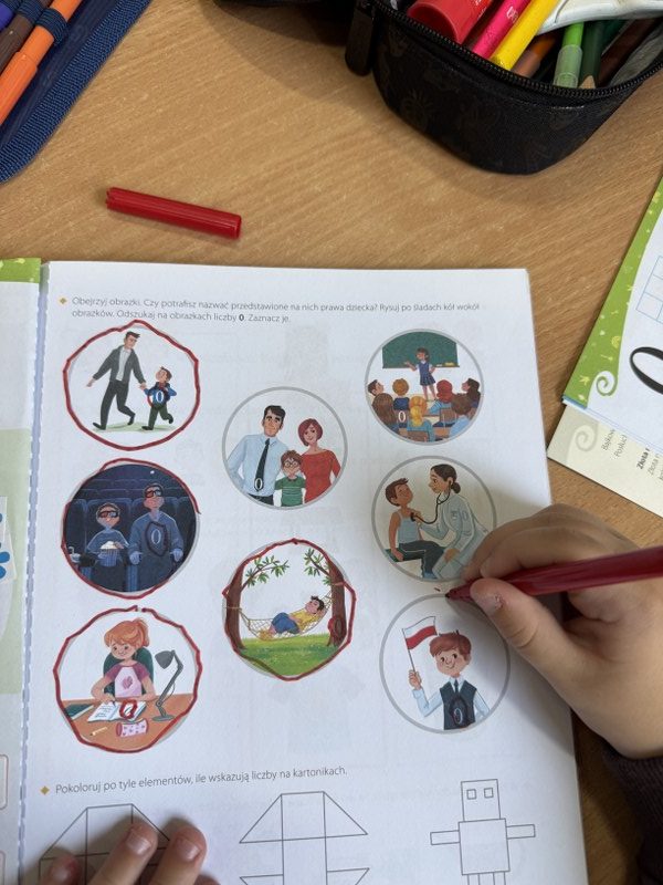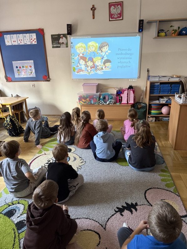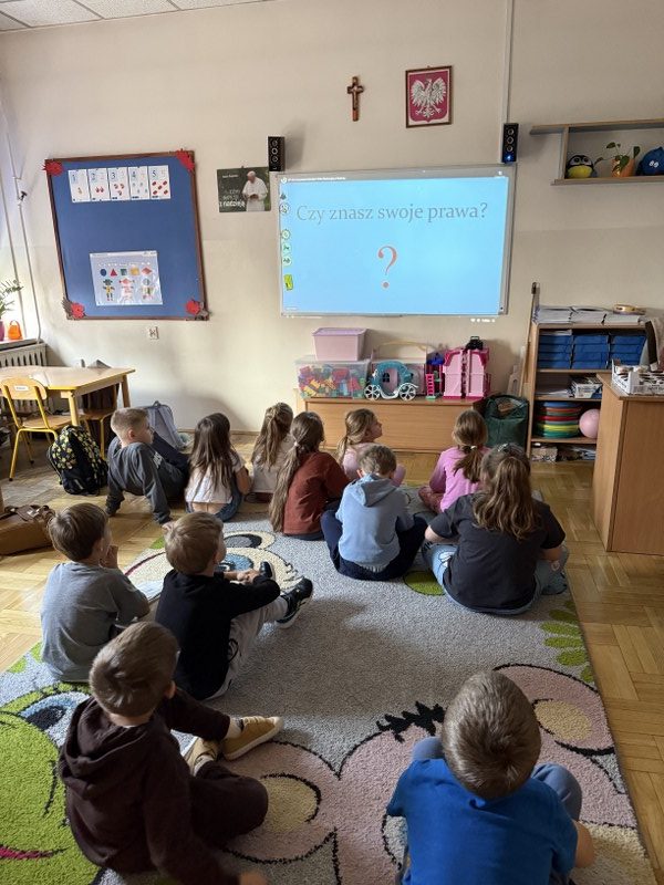 - Klasy 0-1 rozmawiały o tym, co to znaczy być dzieckiem, skupiając się na prostych potrzebach i prawach (np. do przytulania, zabawy, opieki). Oglądając film edukacyjny i tworząc własne ilustracje, najmłodsi zrozumieli pojęcie „prawa” jako ważnej obietnicy.