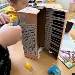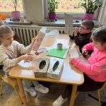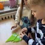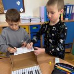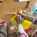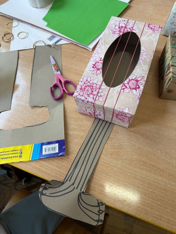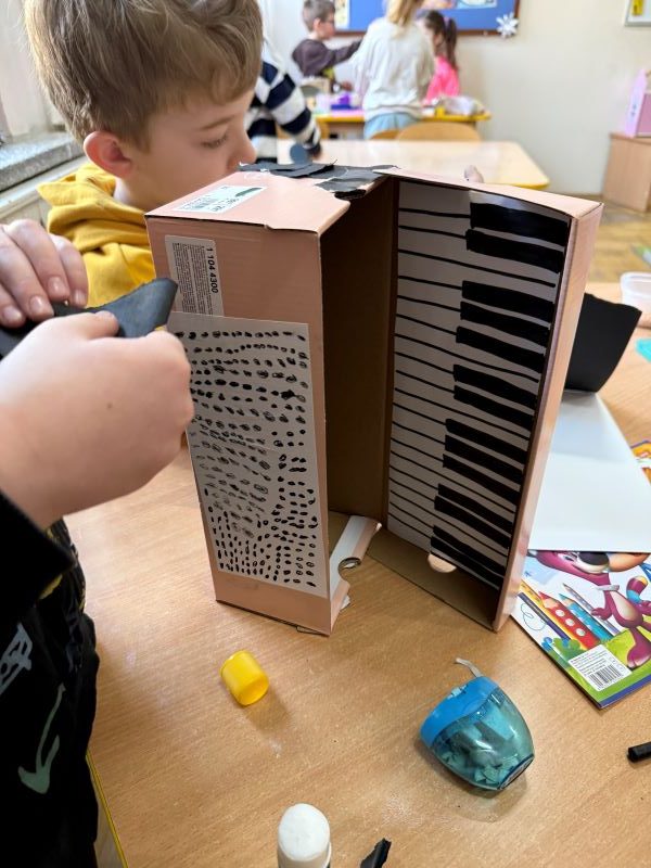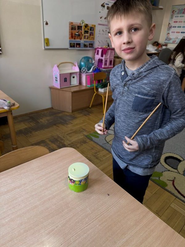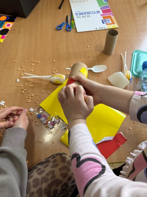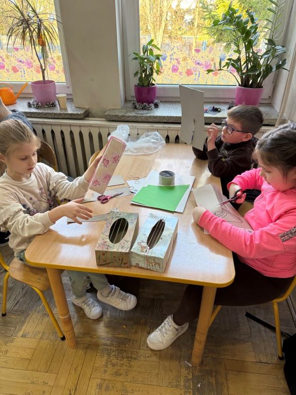 W ramach zajęć mali artyści samodzielnie wykonali instrumenty muzyczne z materiałów przeznaczonych do recyklingu takich jak: plastikowe butelki, rolki po papierze, puszki, kartony czy zakrętki. Powstały kolorowe grzechotki, bębenki, gitary i inne. Każdy instrument był niepowtarzalny i wykonany z ogromnym zaangażowaniem.