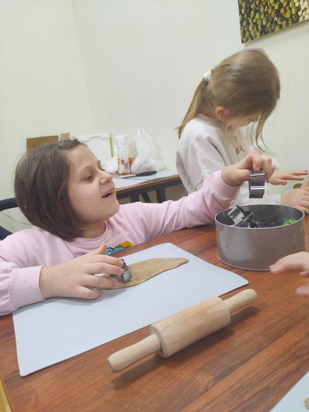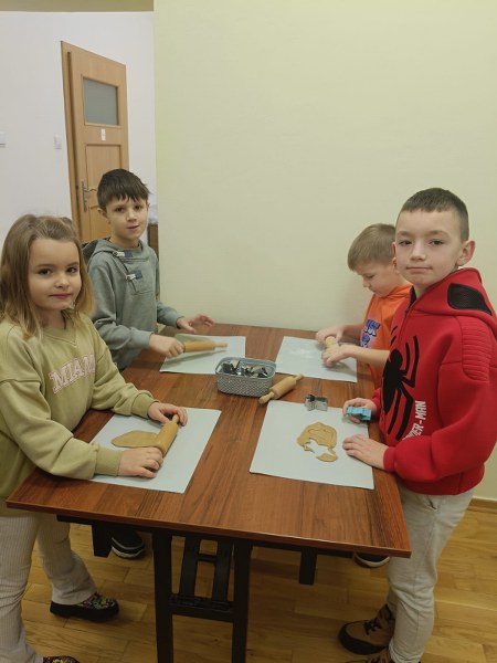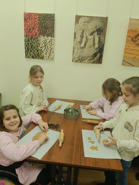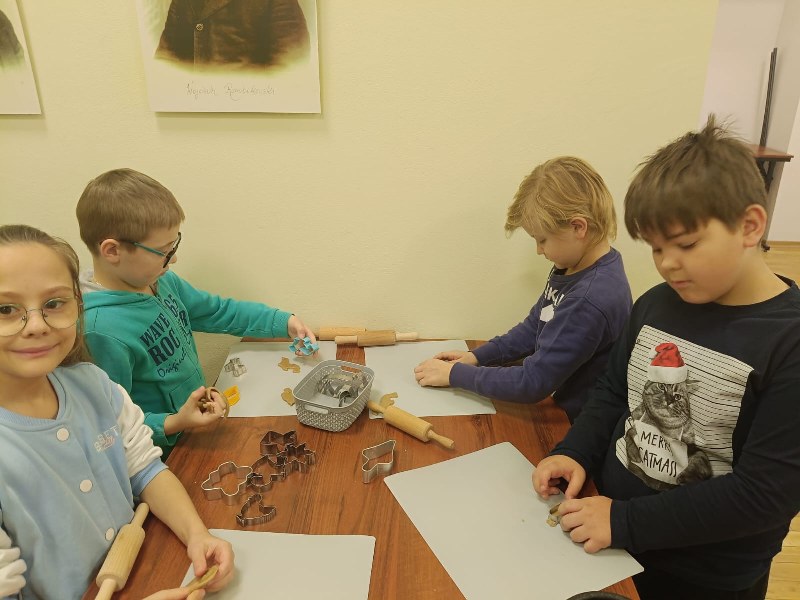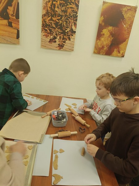 Po emocjonującym zwiedzaniu przyszedł czas na coś znacznie słodszego. Podczas warsztatów piernikowych dzieci poznały proces przygotowywania tradycyjnego piernikowego ciasta. Każdy uczeń mógł samodzielnie wałkować masę i wycinać foremkami różne kształty pierników. Kreatywność dzieci nie miała granic – powstały pierniki tak oryginalne, że niektórzy zastanawiali się, czy to jeszcze ozdoba, czy już dzieło sztuki. Zapach korzennych przypraw unosił się w całej sali, a radość z tworzenia była ogromna.