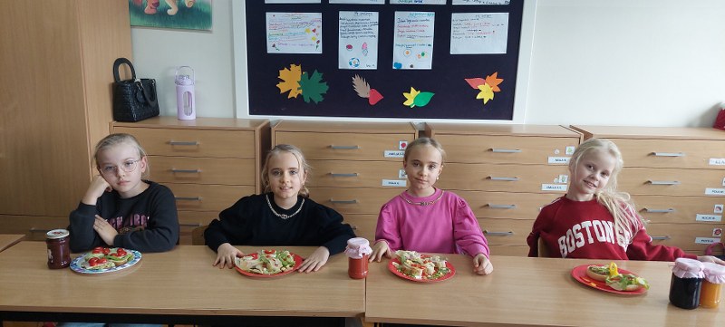 15 października 2025 r. uczniowie z klasy 2b w ramach promocji zdrowego żywienia samodzielnie przygotowali pyszne drugie śniadanie z przyniesionych ze sobą produktów.