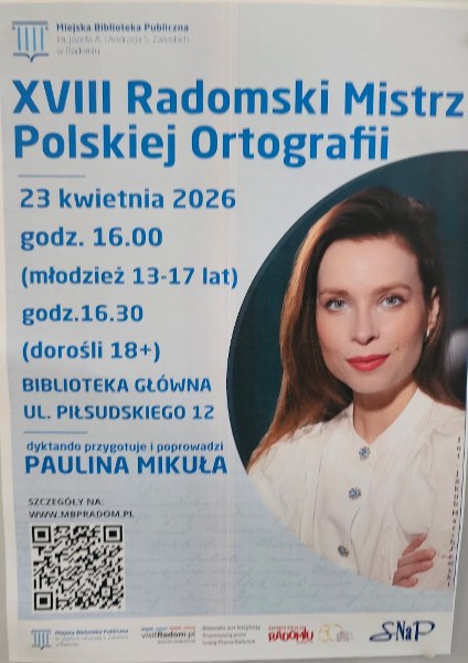 W czwartek 23 kwietnia 2026 r. w Miejskiej Bibliotece Publicznej w Radomiu odbyła się XVIII edycja Konkursu o tytuł Radomskiego Mistrza Polskiej Ortografii.