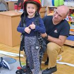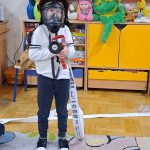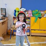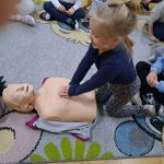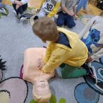 Mieliśmy okazję zobaczyć z bliska sprzęt strażacki, dowiedzieć się, do jakich zadań są wzywani strażacy. Każdy z nas mógł przymierzyć hełm, butlę z powietrzem oraz maskę. Bacznie przyglądaliśmy się i słuchaliśmy naszego gościa, który pokazywał nam, jak należy wykonywać prawidłowo masaż serca. Wszyscy mieliśmy możliwość ćwiczeń praktycznych na fantomie.