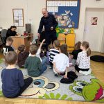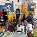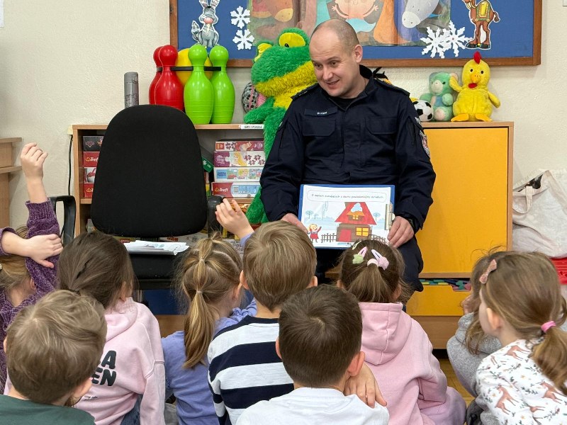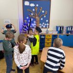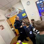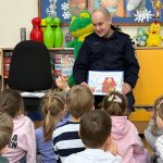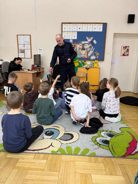 Podczas spotkania pan policjant przypomniał również podstawowe zasady bezpieczeństwa, m.in. jak prawidłowo przechodzić przez jezdnię, jak zachować się w kontakcie z osobą nieznajomą oraz kiedy należy poprosić o pomoc policjanta. Zwrócił również uwagę dzieci na bezpieczeństwo podczas zbliżających się ferii.