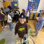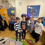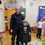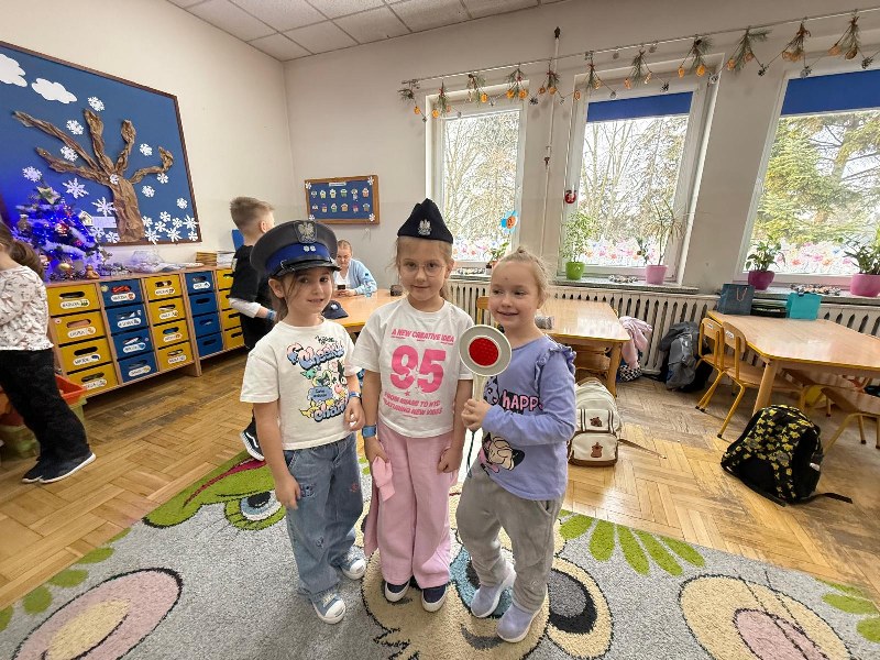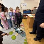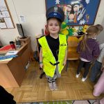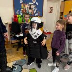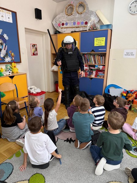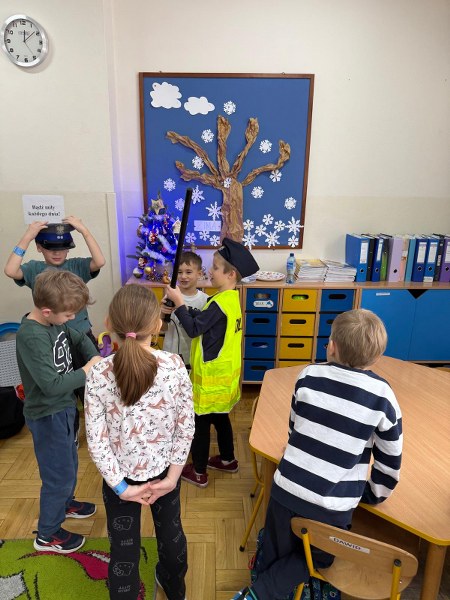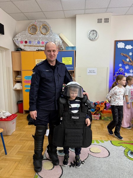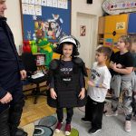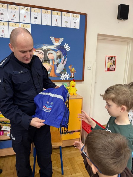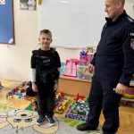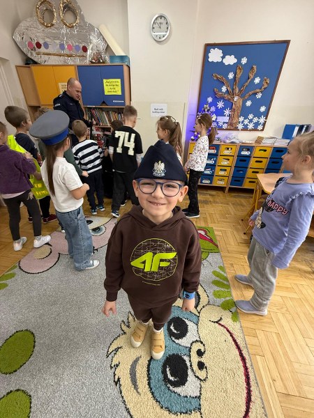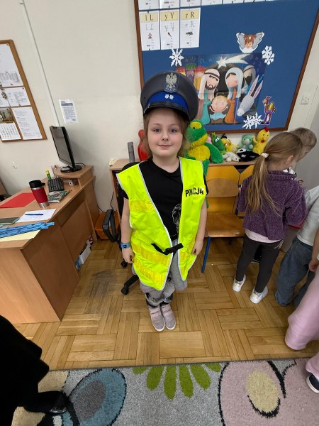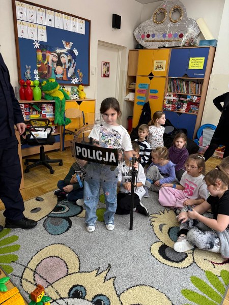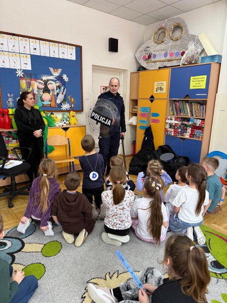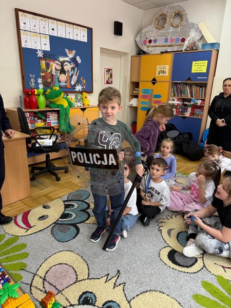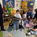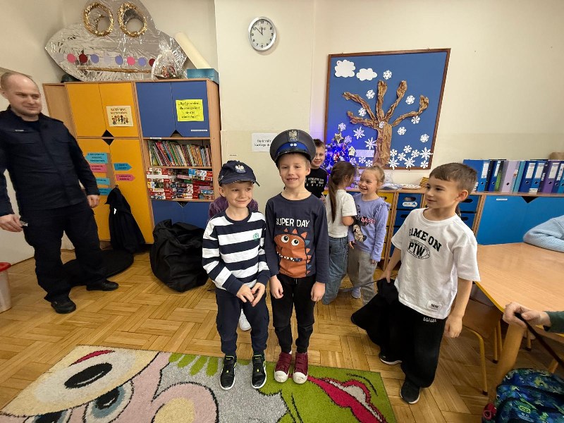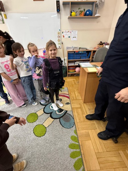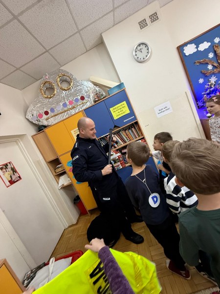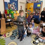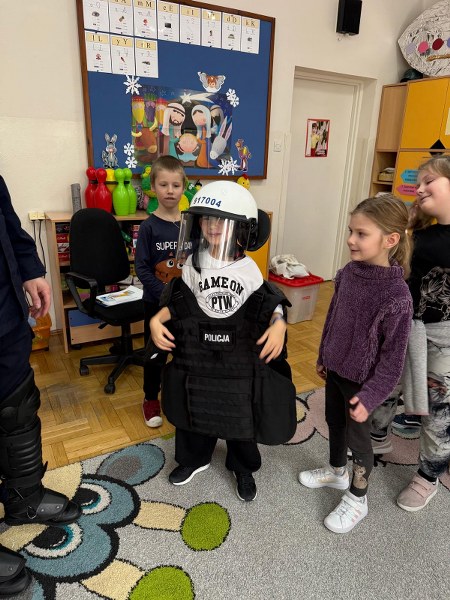 Dużym zainteresowaniem dzieci cieszyła się prezentacja policyjnego umundurowania i wyposażenia. Gość zaprezentował elementy stroju policyjnego, m.in. czapki, kamizelkę odblaskową, kamizelkę kuloodporną, rękawiczki, pałkę policyjną, pas służbowy, kajdanki. Dzieci mogły z bliska obejrzeć sprzęt, dowiedzieć się, do czego służy, zadać pytania oraz przymierzyć niektóre.