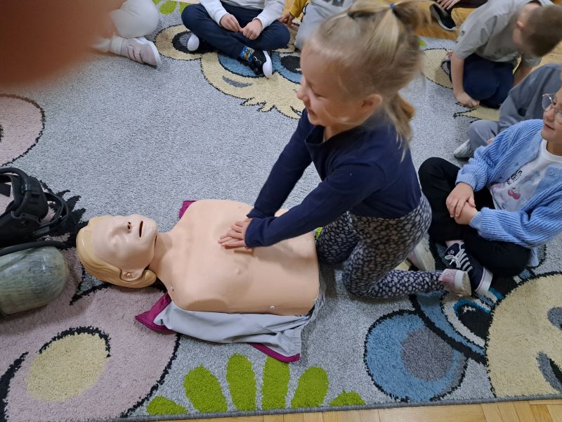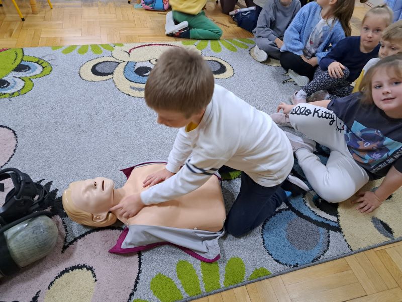 Mieliśmy okazję zobaczyć z bliska sprzęt strażacki, dowiedzieć się, do jakich zadań są wzywani strażacy. Każdy z nas mógł przymierzyć hełm, butlę z powietrzem oraz maskę. Bacznie przyglądaliśmy się i słuchaliśmy naszego gościa, który pokazywał nam, jak należy wykonywać prawidłowo masaż serca. Wszyscy mieliśmy możliwość ćwiczeń praktycznych na fantomie.